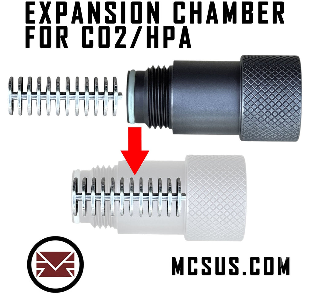 Extreme Performance 12-Chamber Expansion Chamber / HPA Volumizer features a modular two-piece design consisting of a 12-chamber expansion ring and an adapter main body. Small and compact, it adds less than 1.5 in / 36 mm to the overall length. Precision-machined from 6061 aircraft-grade aluminum, it weighs only 2 oz, delivering maximum performance.